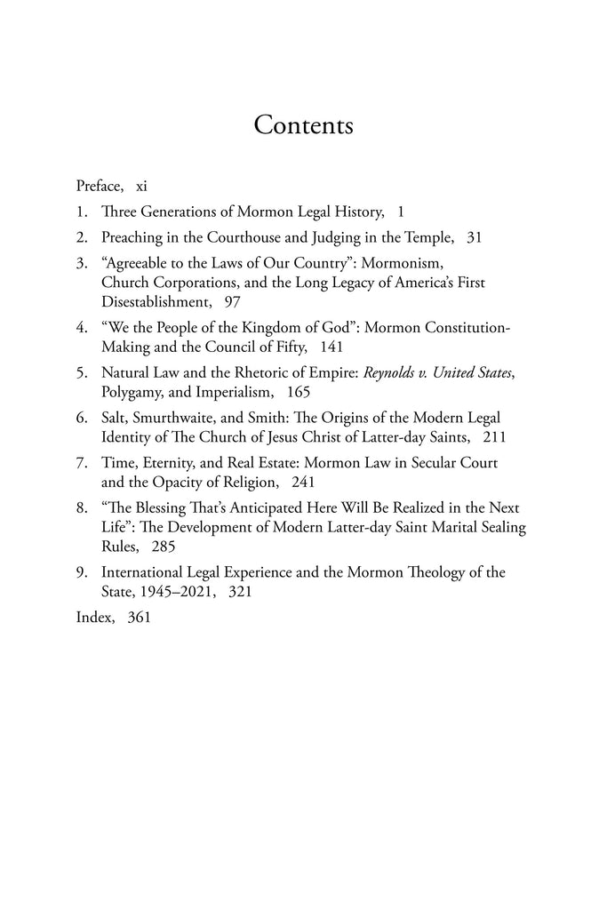 “Unlike most discussions of the intersection of law and religion, these essays manage to give each subject its due without diminishing the other. Consequently, their insight exceeds their denominational setting, escaping its apologetic limits and illuminating more than Mormon legal history. Collectively, these essays show the variety of means by which law does (and arguably must) regulate religion, notwithstanding constitutional disestablishment. No less, they show how religion makes use of law, even shapes law, to keep itself religious within a secular environment. Having used them in the classroom, as well as for my own education, I can recommend them to the general and academic reader alike for their insight, clarity, and wit. They are a thought-provoking pleasure to read.” — Kathleen Flake, author of The Politics of Religious Identity: the Seating of Senator Reed Smoot, Mormon Apostle