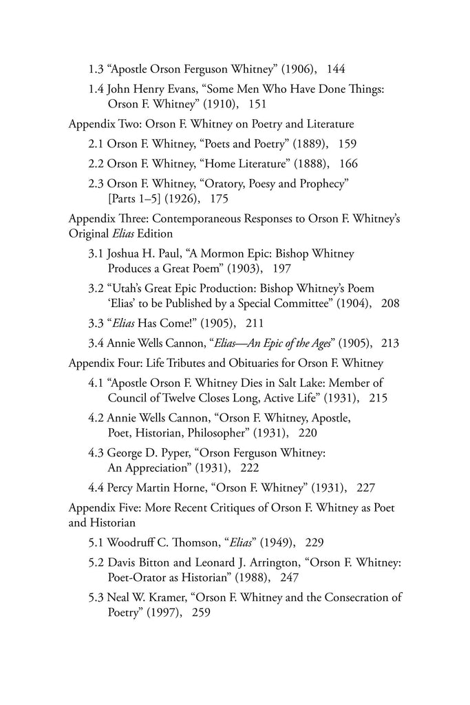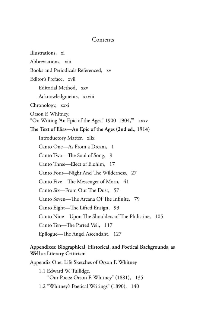 "Orson Whitney was the preeminent Latter-day Saint man of letters at the turn of the twentieth century. Reid Nielson has brought this ambitious writer and poet back to life with a critical edition of Whitney’s vast poem Elias: An Epic of the Ages. Whitney sought to pour everything he knew and experienced as a gospel believer into one grand work. Neilson annotates Elias and embeds it in the sources emanating from Whitney’s work: autobiographical reflections, contemporary reviews, Whitney’s own critical work, and assessments of Whitney’s overall achievement. Anyone interested in Latter-day Saint literature will want this book on their shelves." — Richard Lyman Bushman, author of Joseph Smith: Rough Stone Rolling